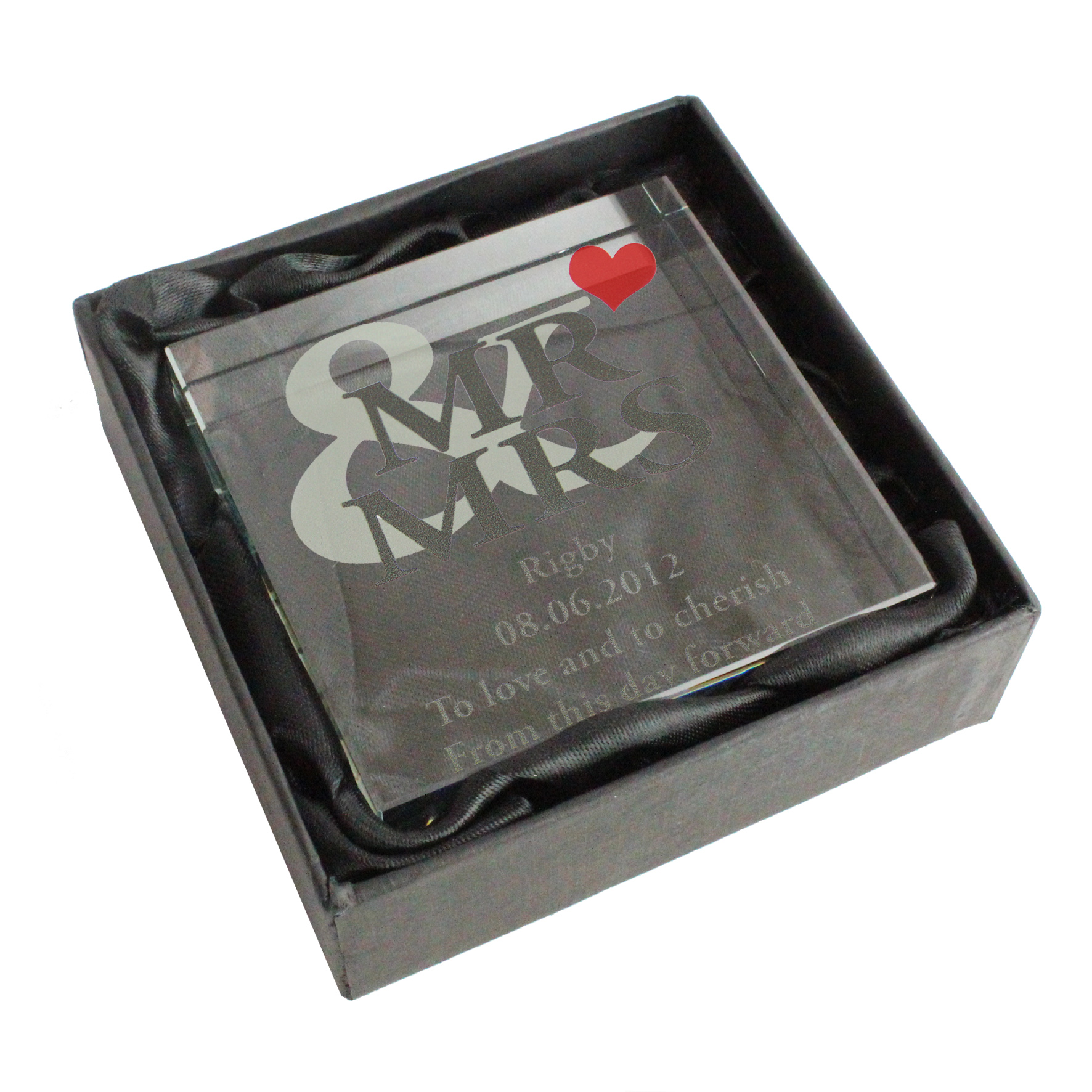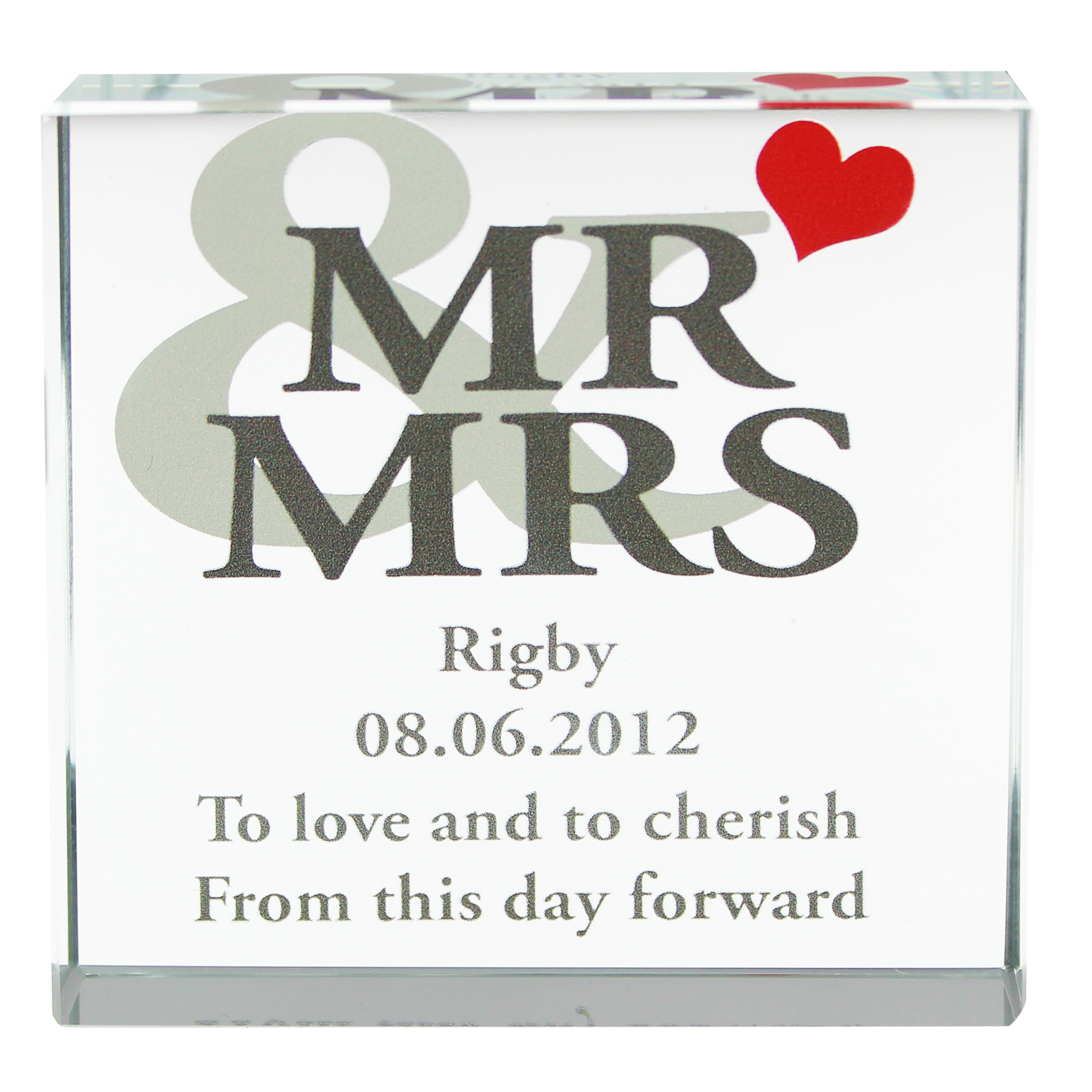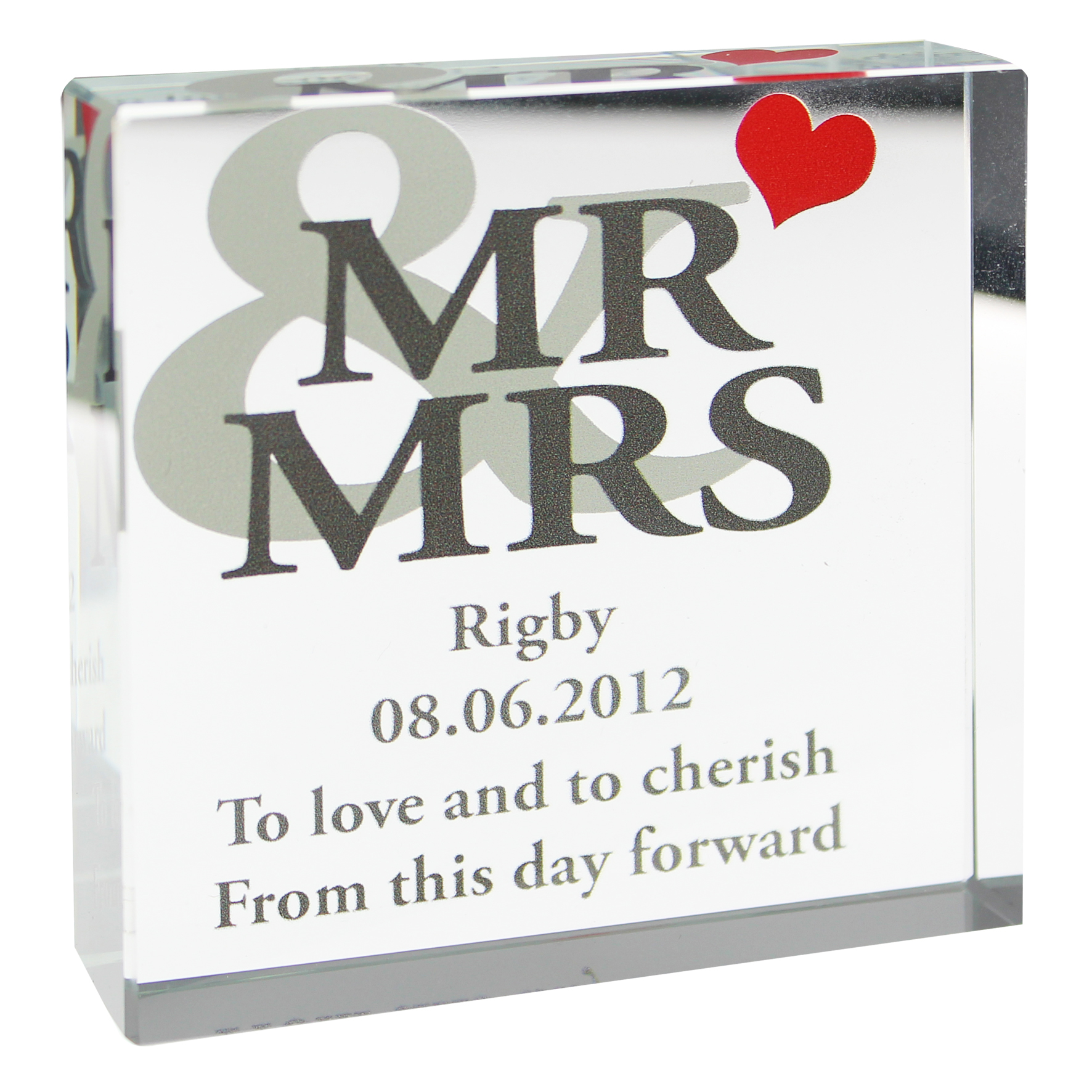 A lovely personalised wedding keepsake gift. This large Mr & Mrs personalised glass block comes with any message of your choice over 4 lines (up to 25 characters per line).