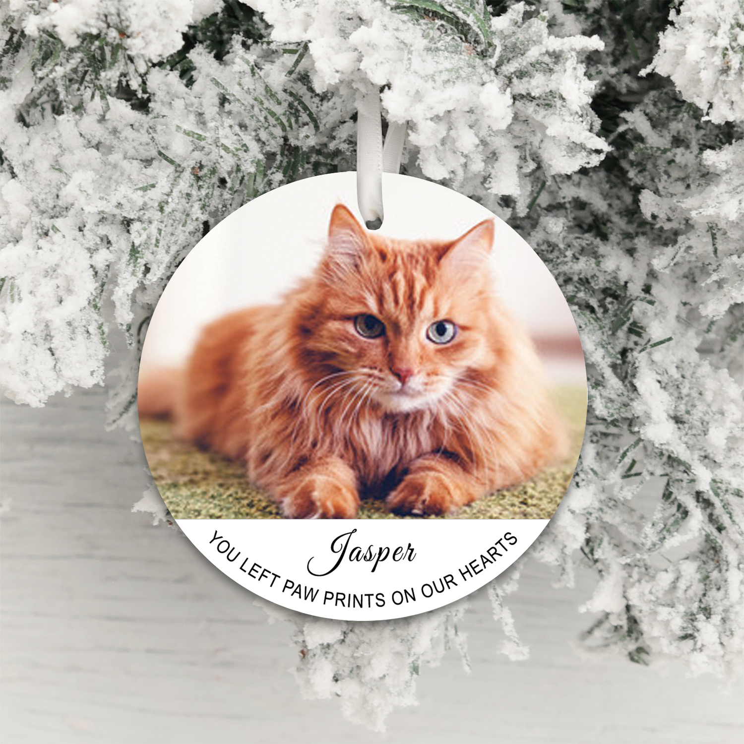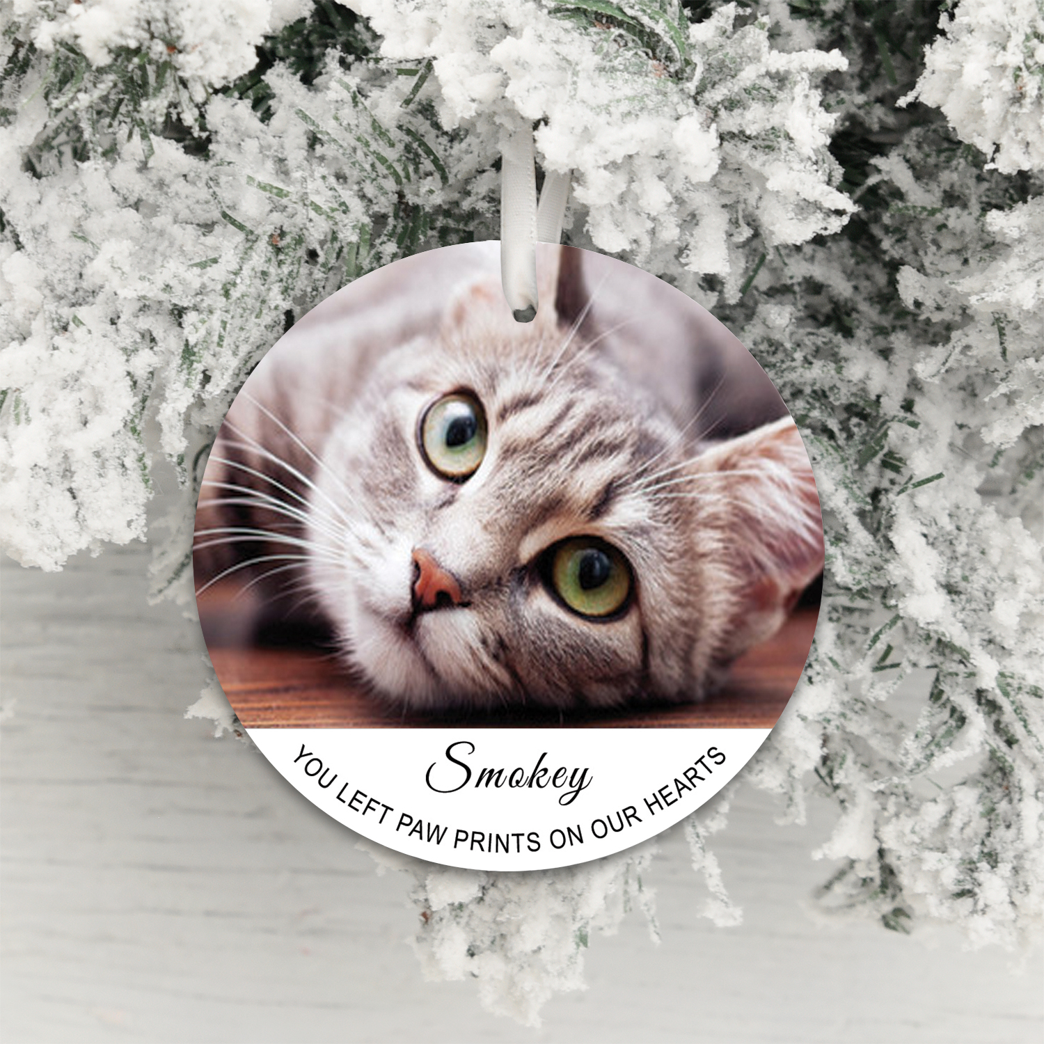 This Paw Prints On Our Hearts Pet Photo decoration can be personalised with a photo and a name.