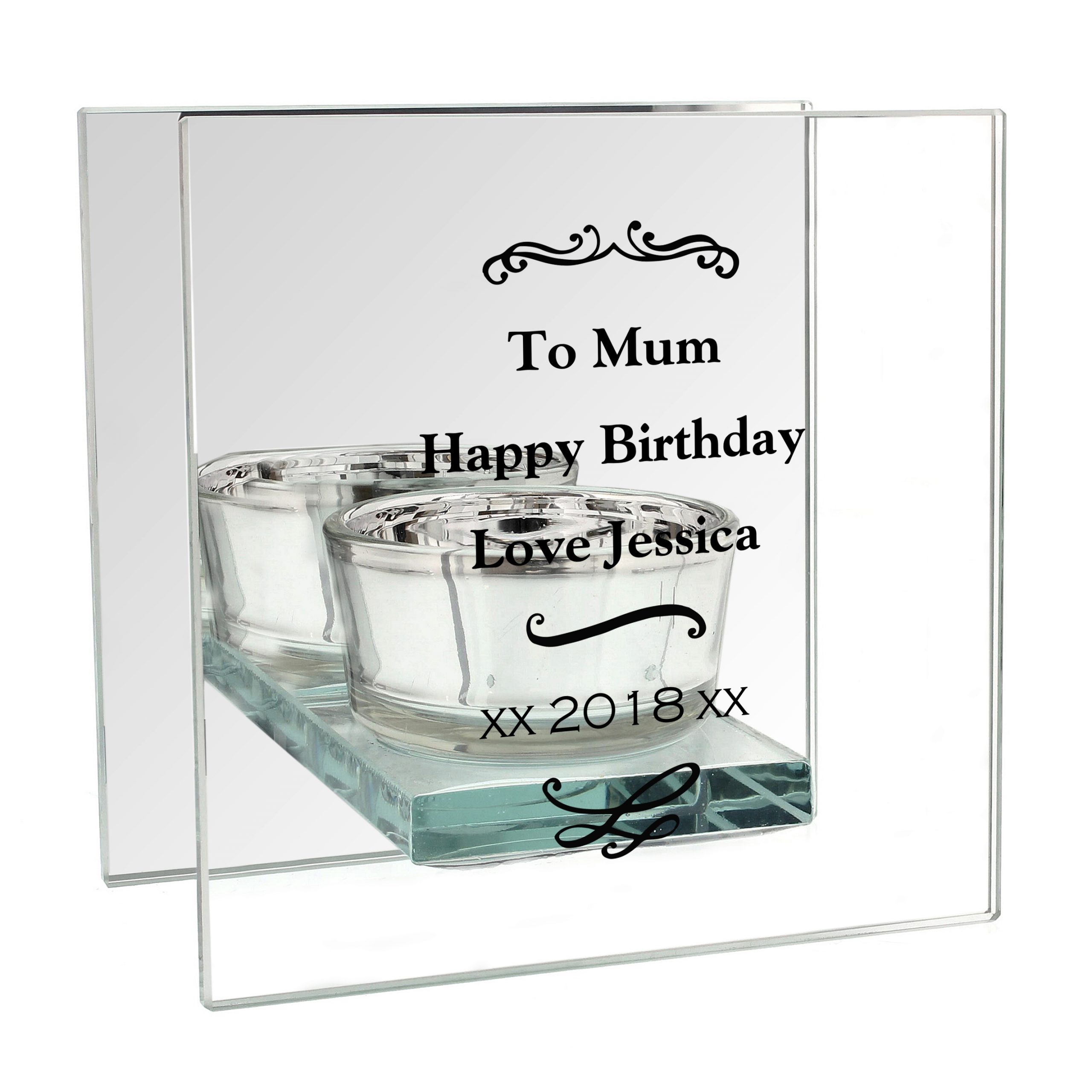 Personalise this ‘Antique Scroll’ Mirrored Glass Tea Light Candle Holder with up to 4 lines of 15 characters.