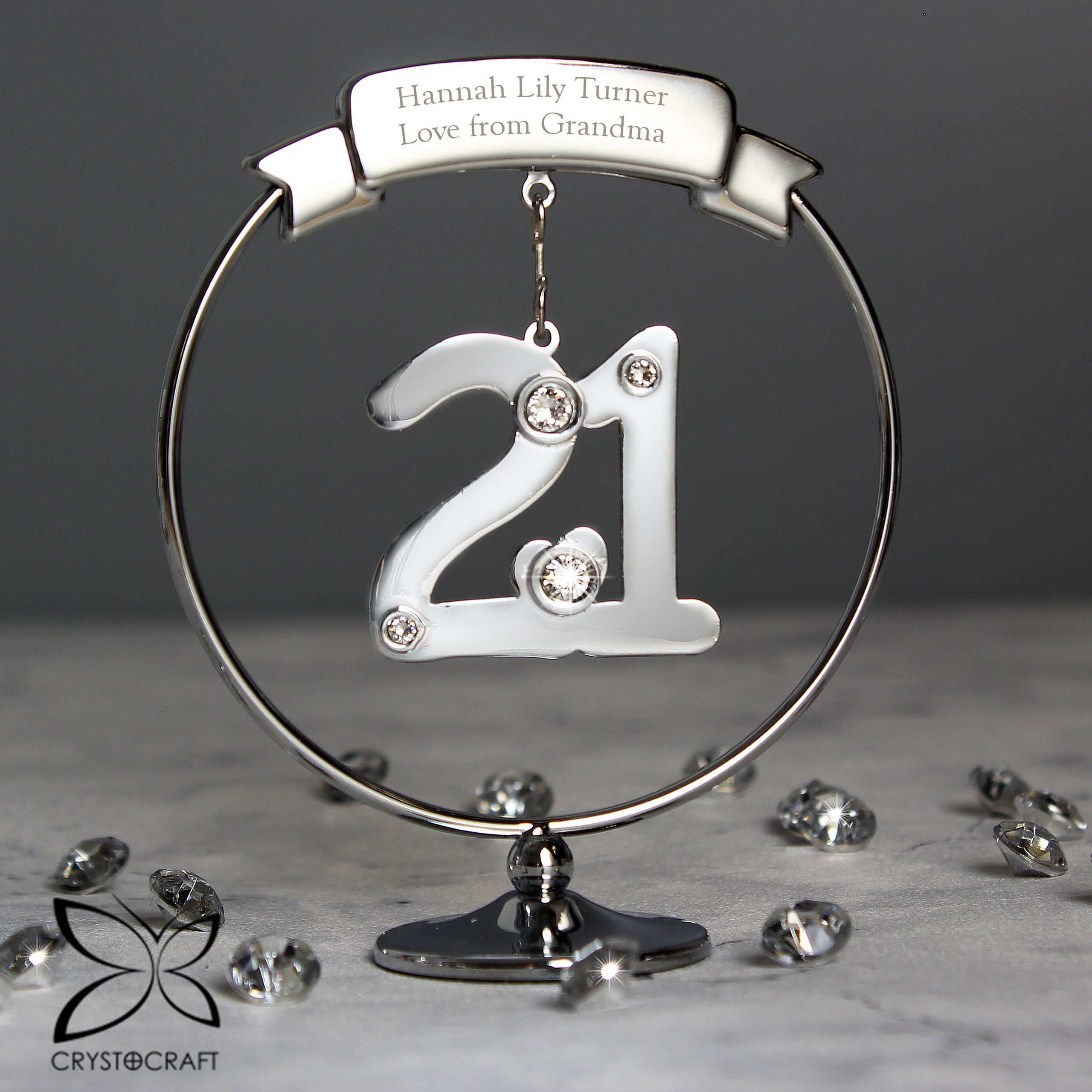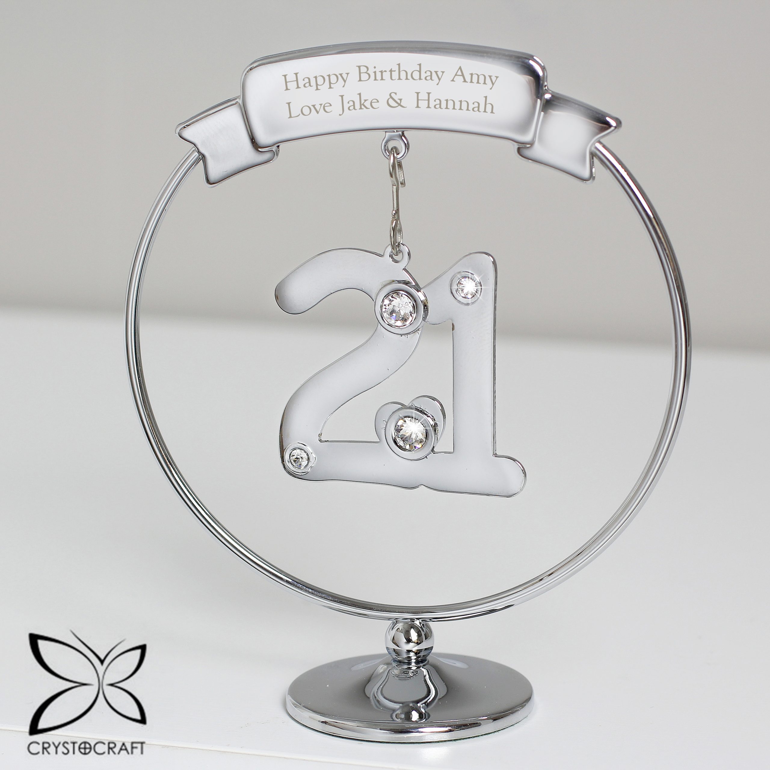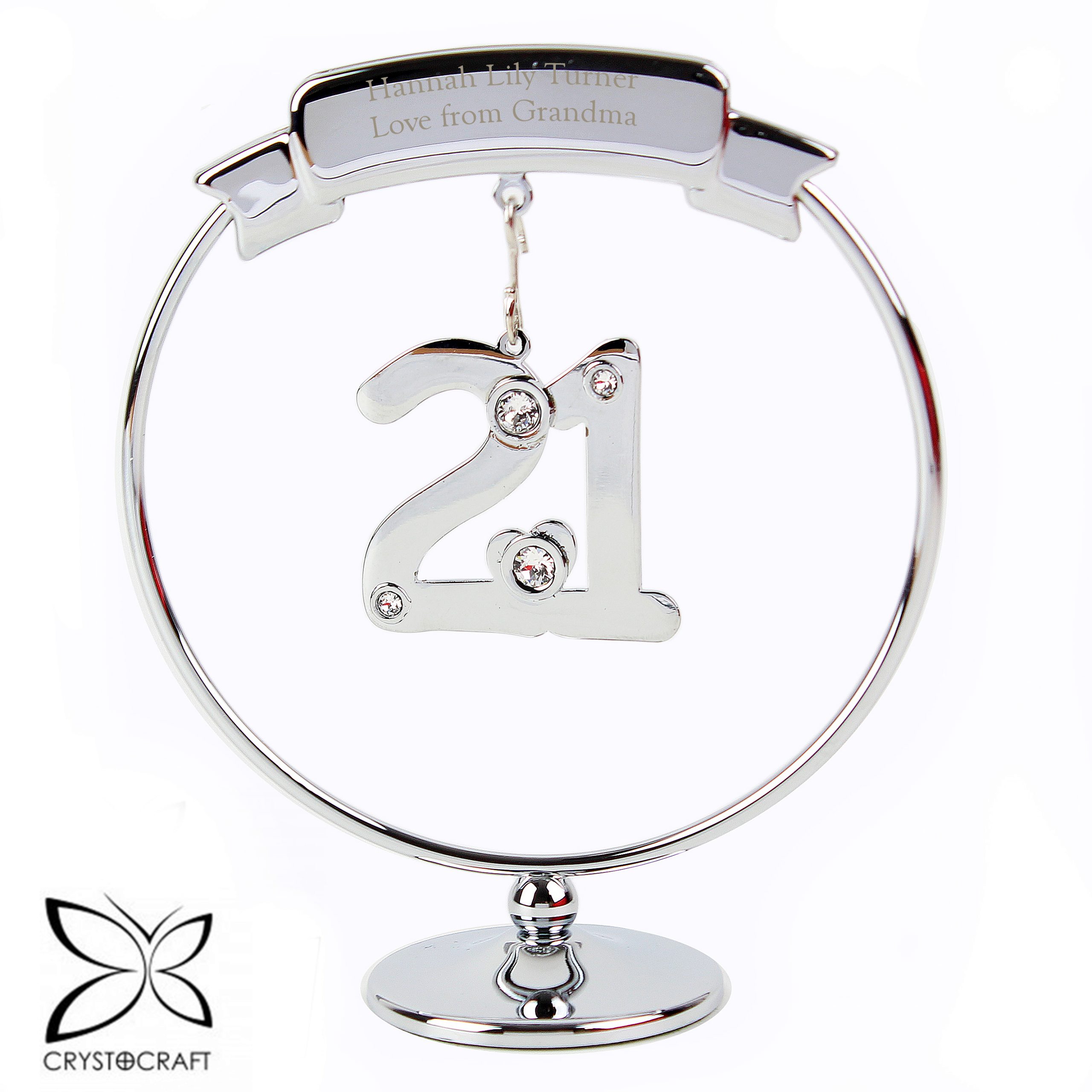 Mark their 21st Birthday with this elegant Crystocraft ornament. Dangling from a personalised round silver stand, is a crystal clad 21