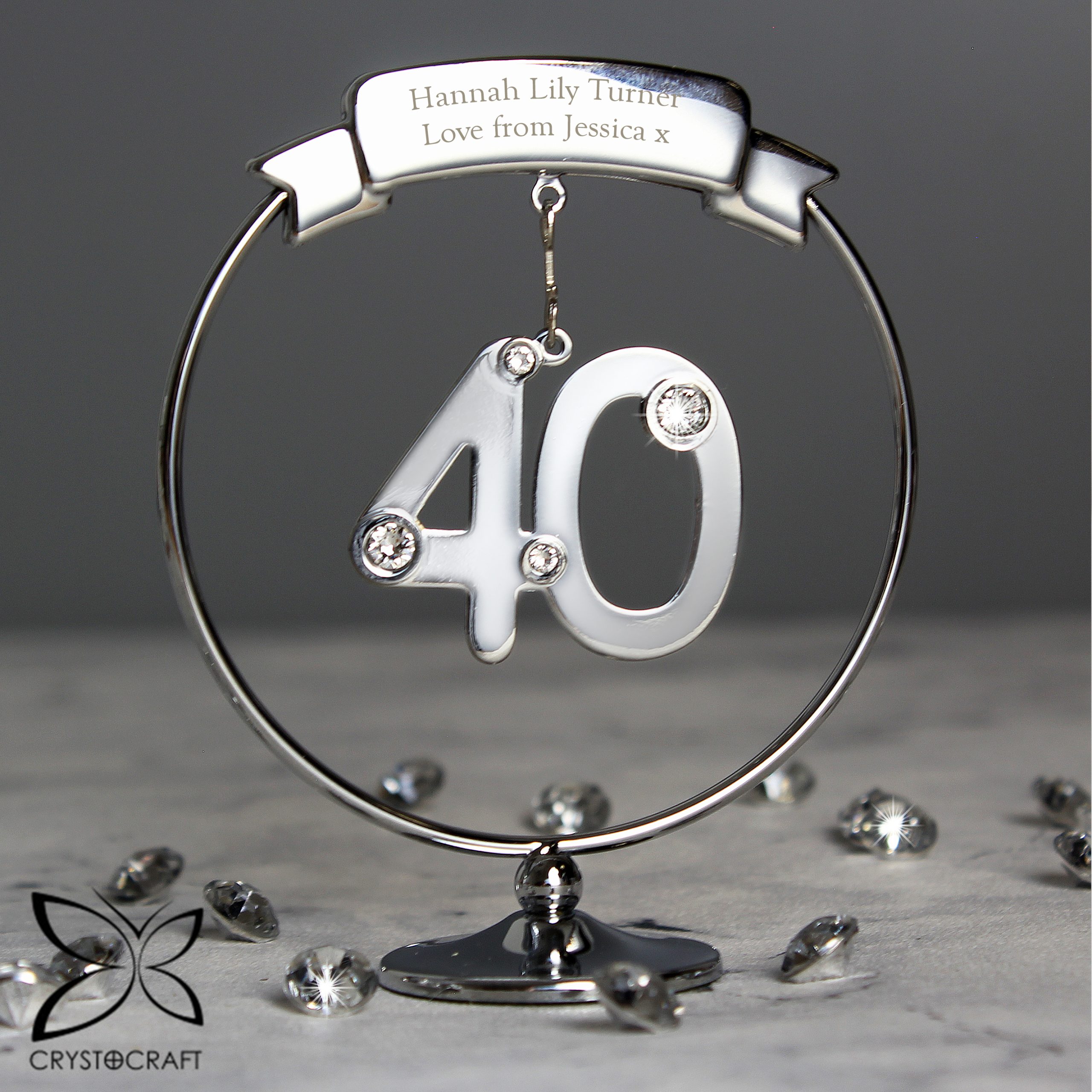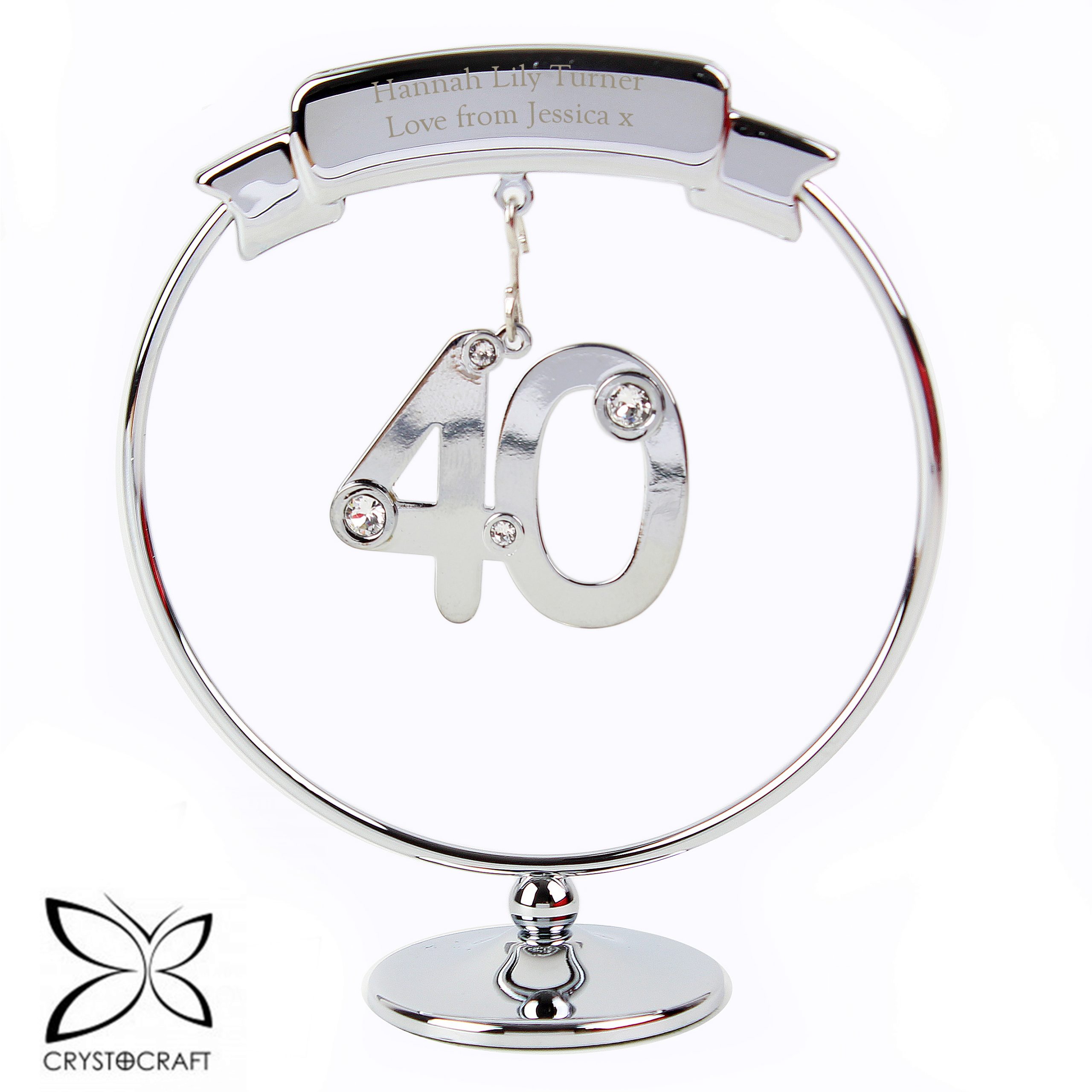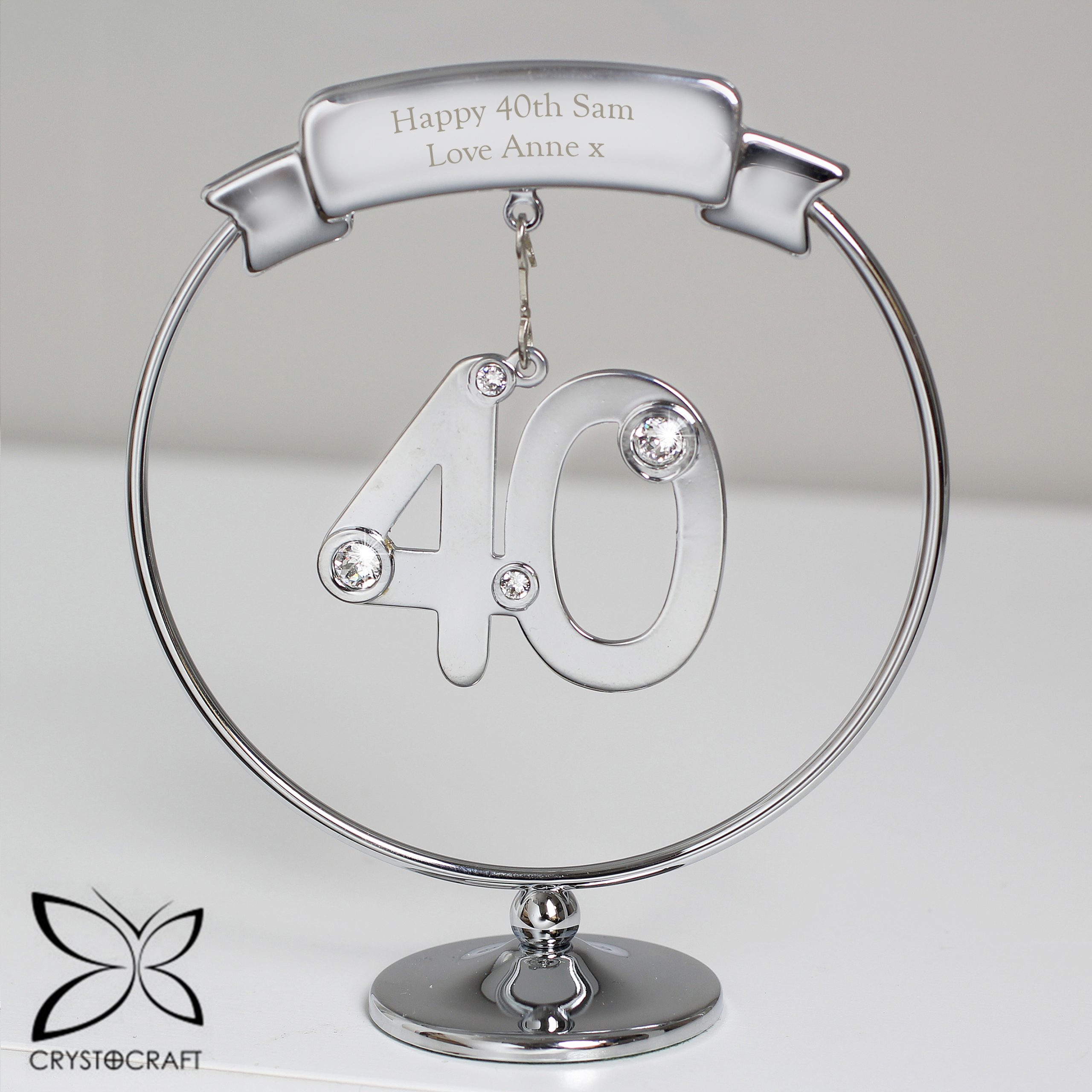 Mark their 40th Birthday or Wedding Anniversary with this elegant Crystocraft ornament. Dangling from a personalised round silver stand ia a crystal clad 40. This will catch the light and bring a smile to the recipients face.