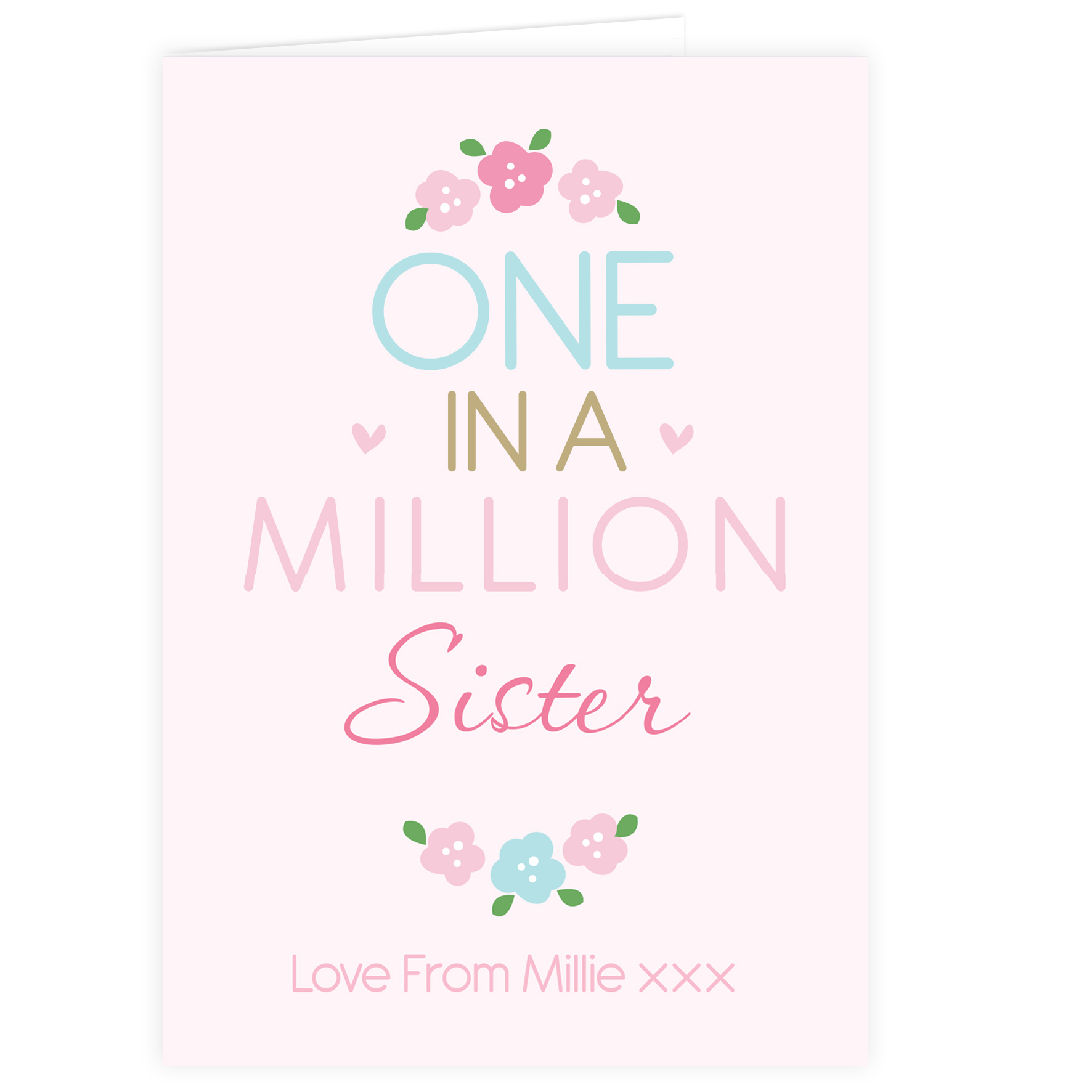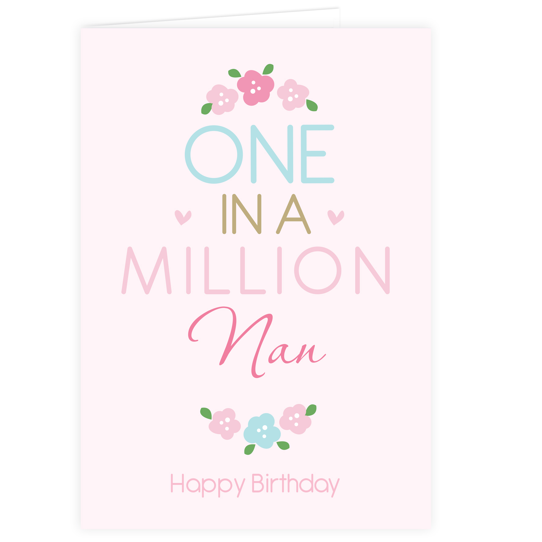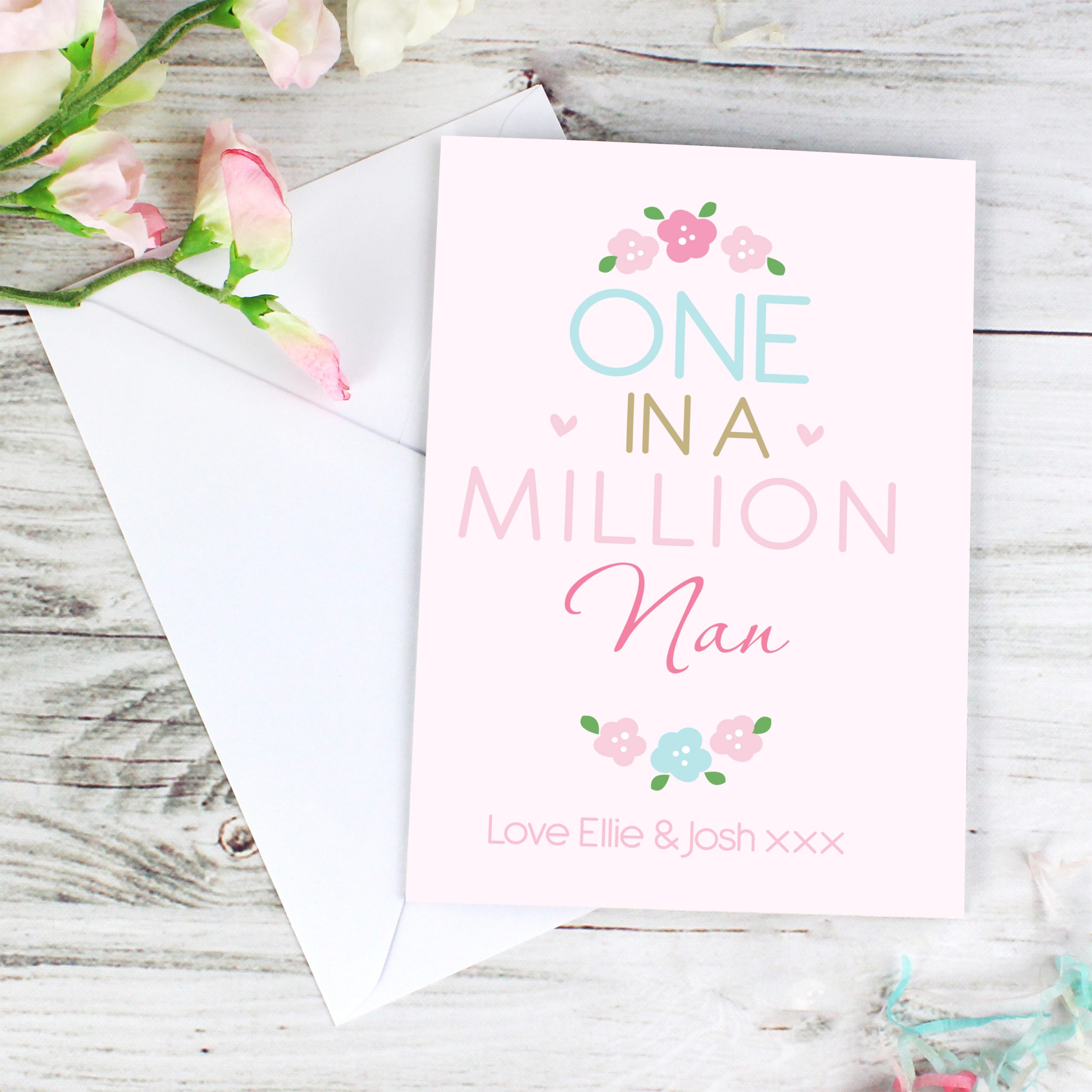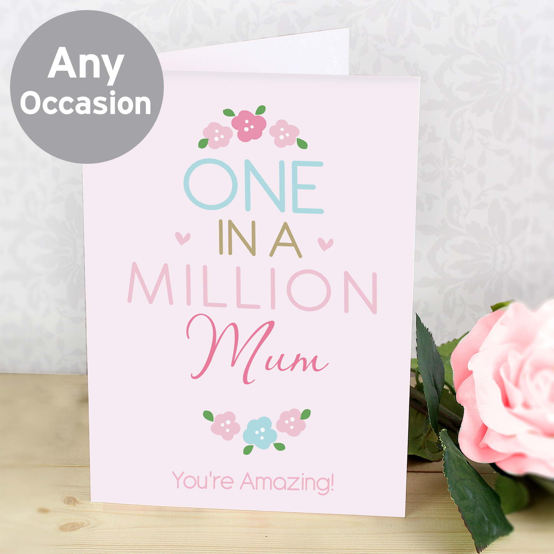 Personalise the front of this One in a Million Card with a role/name up to 12 characters and a message up to 20 characters in length. ‘One in a Million’ is fixed text. You can then add your own personalised message to the inside of the card over 5 lines of up to 20 characters per line. All personalisation is case sensitive and will appear as entered.