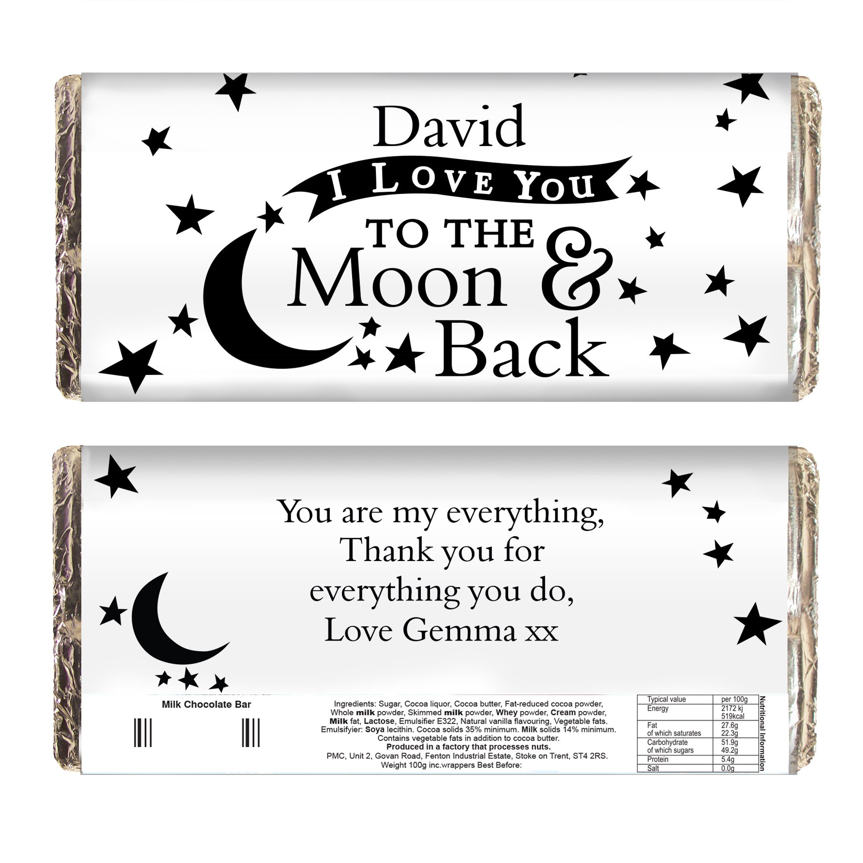 Personalise this delicious ‘To the moon and back’ chocolate bar with a name up to 12 characters long to the front and a message over 4 lines of 25 characters on each line to the back.