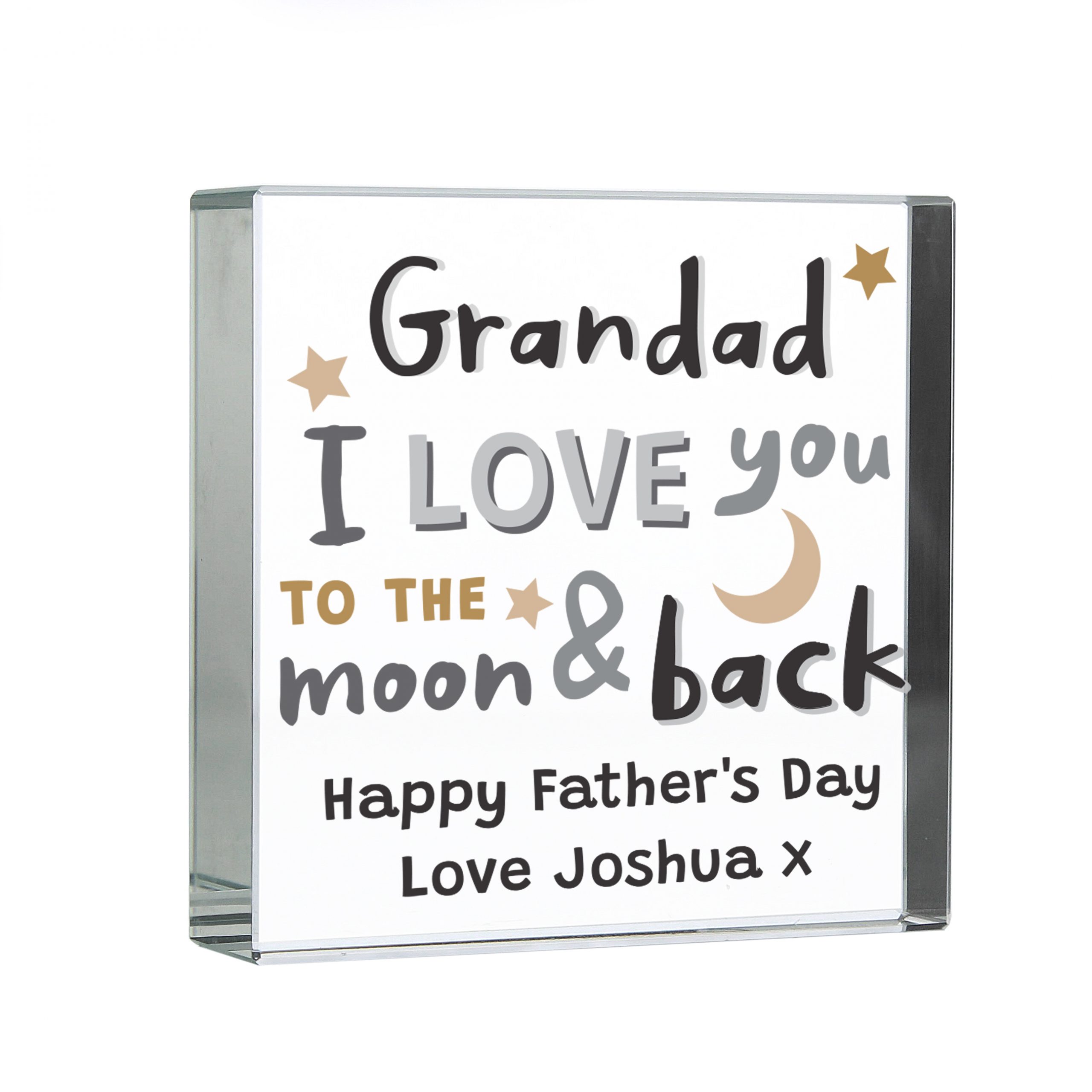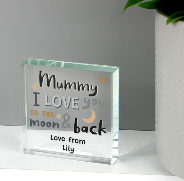 Personalise this To the Moon & Back Large Crystal Token with a name up to 12 characters long and a message with up to 2 lines of text, with a maximum of 20 characters per line.