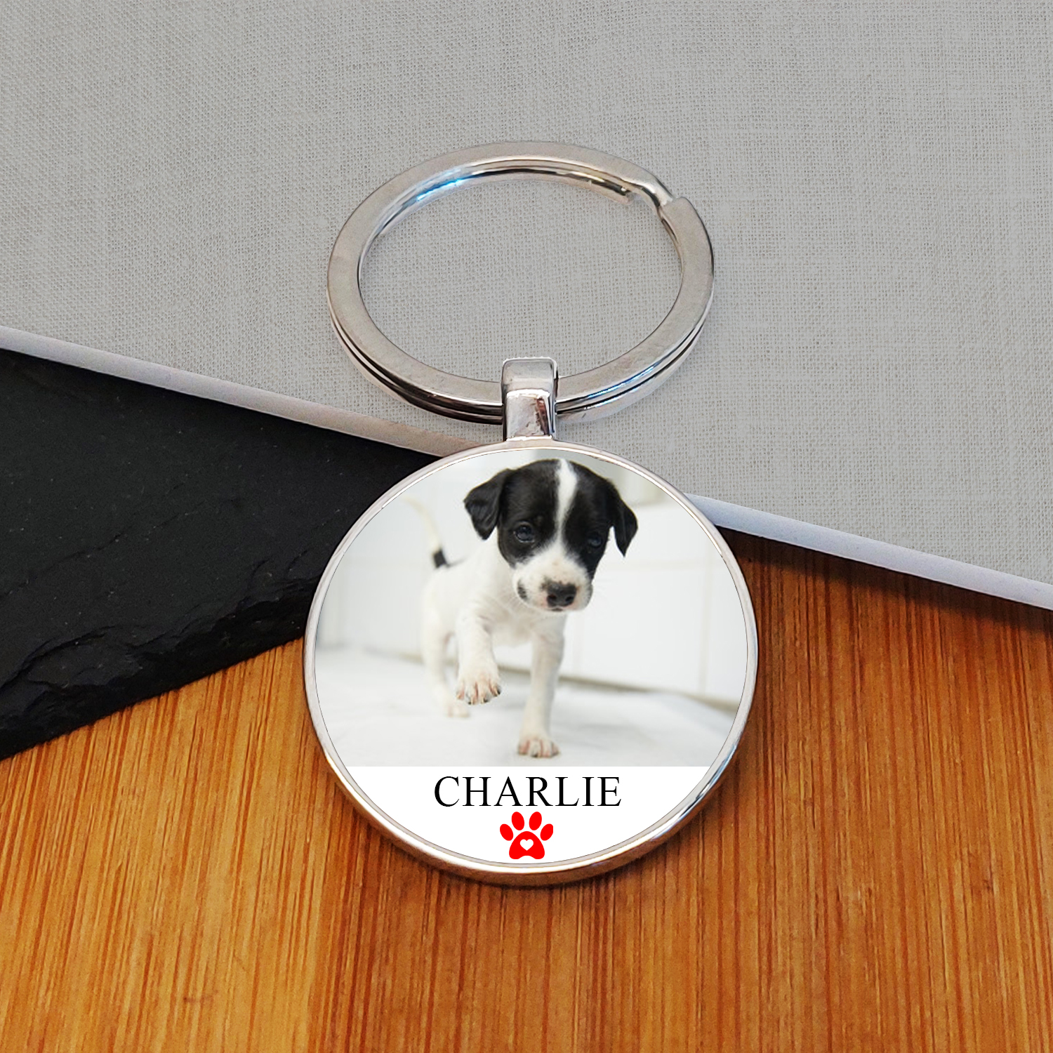 Choose a favourite photo to add to this beautifully made Pet Photo Upload and Text Key Ring. Then add your own text to the red paw design. The perfect gift for any pet lover.
