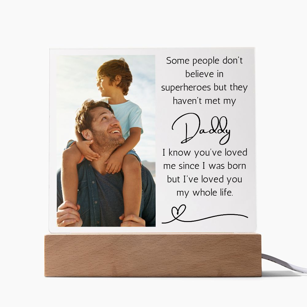This Father’s Day, give your new dad or any loving father figure in your life a special gift that will make their heart swell with pride and joy. Our premium acrylic picture frame is the perfect present that will showcase your favorite photo of your little one and include a heartwarming message to make it a truly unforgettable keepsake. This modern design will easily complement any room in their home or office and become a conversation starter with its sleek wooden base. Add an extra special touch with the optional LED wooden base that will illuminate the frame and make it stand out even more.