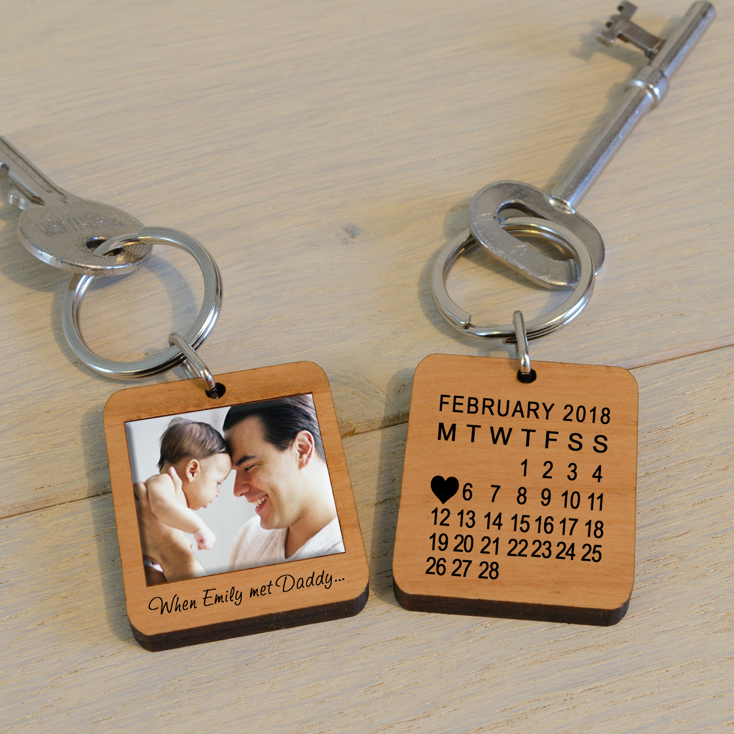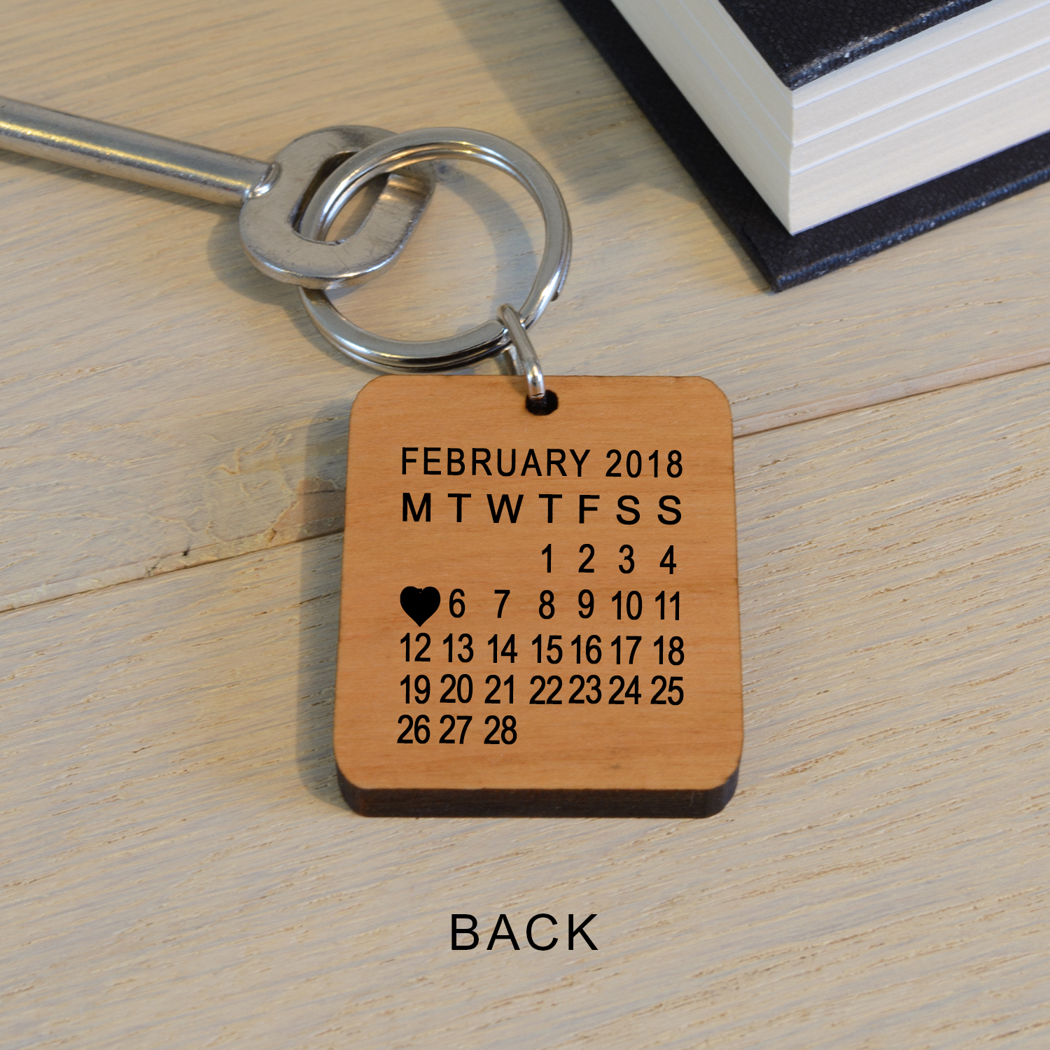 The reverse of the key ring has a calendar with a heart engraved on the date you require.